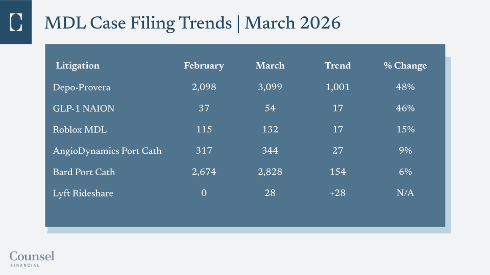 Mass Torts, Blog March JPML Market Intelligence By: Adam Mosher | Director, Client Development March 04, 2026 Source March report Mass Torts, Blog